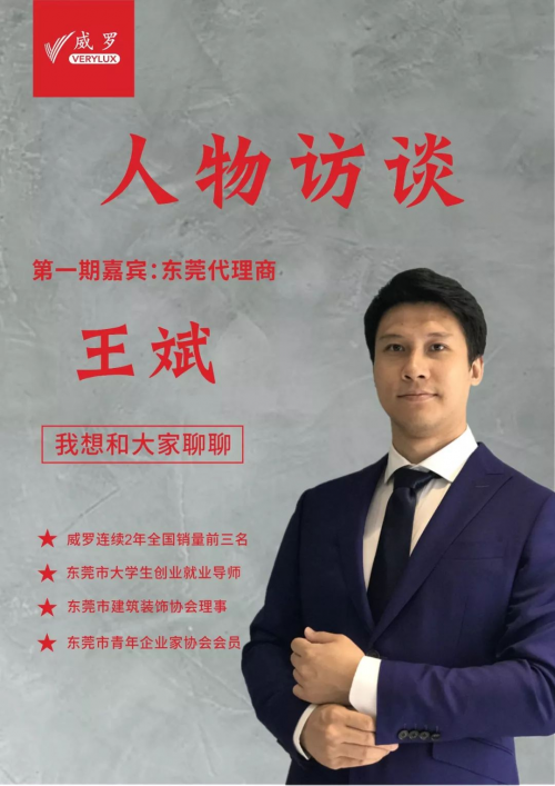 王斌,東莞威羅代理商,2017年和2018年連續兩年全國銷售額前三名,東莞大學學生企業家和就業導師,東莞建筑裝飾協會理事,東莞青年企業家協會會員,致力于意大利原裝進口藝術涂料的推廣和運營,威羅是王總的第一個創業項目。