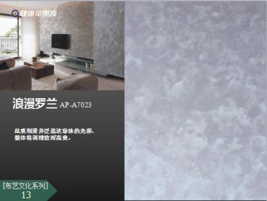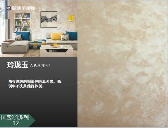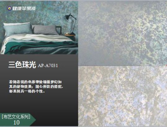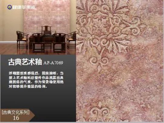 健康蘋果文化藝術涂料分為四個系列:而每個系列,因為色彩和表現(xiàn)手法的不同,又可以延伸出多種藝術效果,每個系列都有不同的表現(xiàn)手法。