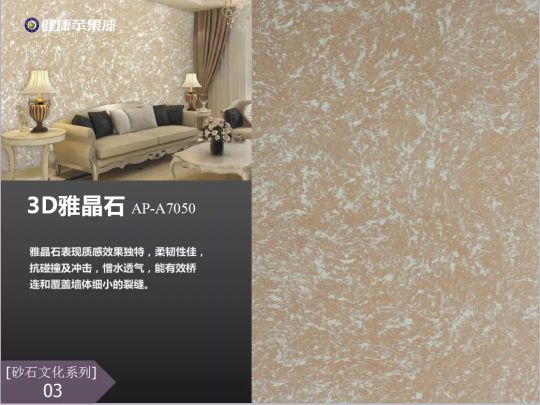 適用范圍:亮珠光的涂裝,平面可帶來強烈的玉石層疊效果,彰顯奢華的裝飾風格。適合高檔場所,也適用于家庭客廳、房間、墻面涂裝以及辦公室墻面涂裝。