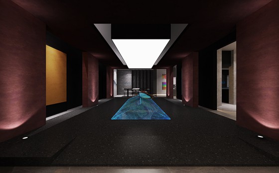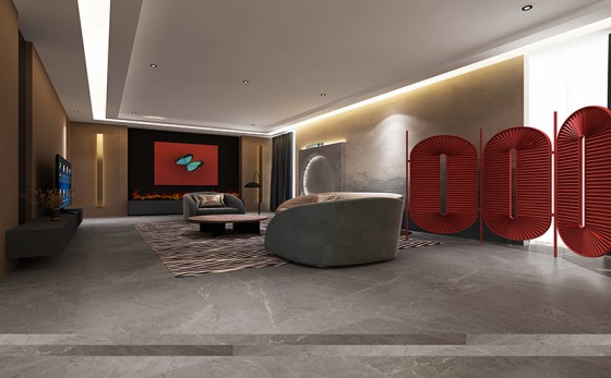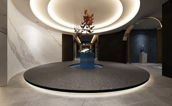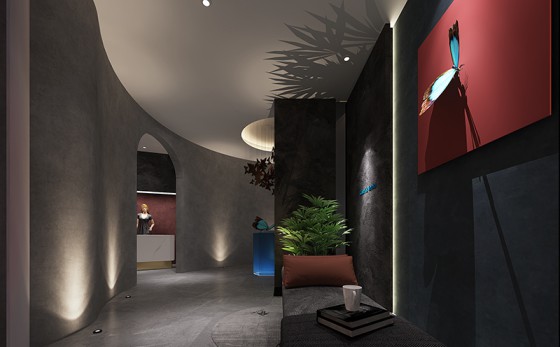 半圓或圓形的裝飾墻都巧妙運用中國流行的圓通柔和設計,經典的中國紅把高級灰冷色調瞬間撼動,仿佛太陽的血在云海和太空中漫開,映現出壯麗的血紅。使空間冷曖相宜,舒適而愜意,精致而高雅。