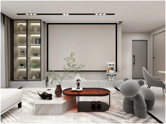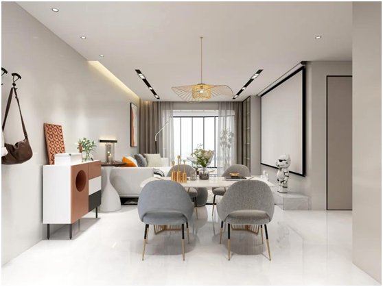 使用現代簡潔的線條表達出當代生活的高端品質與態度,布質沙發、大理石茶幾以及色調與家具完美契合的質感地毯,均以絕佳的材質,展現出對精致生活的追求。
