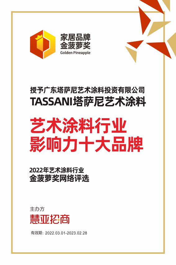 珠玉在前。近日,由慧亞招生網(wǎng)主辦的“中國家居品牌金菠蘿獎”榜單揭曉,該獎項至今已經(jīng)舉辦11年,收到過百萬家居行業(yè)經(jīng)銷商關(guān)注參與,被譽為家居行業(yè)含金量最高的獎項,更成為行業(yè)的風(fēng)向標(biāo),同時也是經(jīng)銷商精選優(yōu)質(zhì)好品牌的重要參考。意大利TASSANI塔薩尼藝術(shù)涂料憑借優(yōu)秀的品牌綜合實力脫穎而出,榮獲【藝術(shù)涂料行業(yè)影響力十大品牌】獎項,可謂雙喜臨門!
