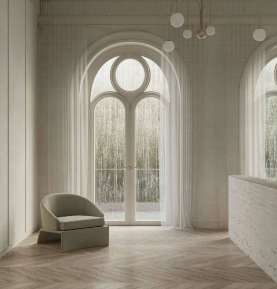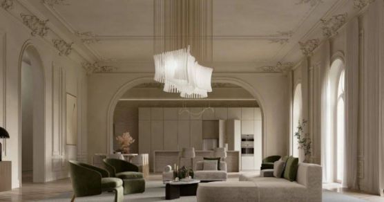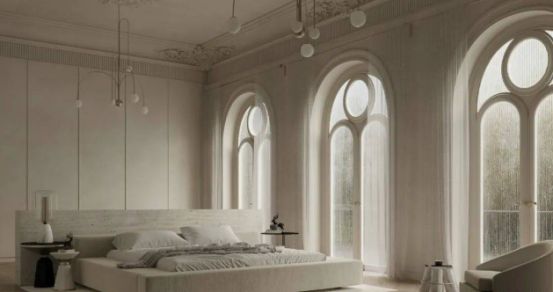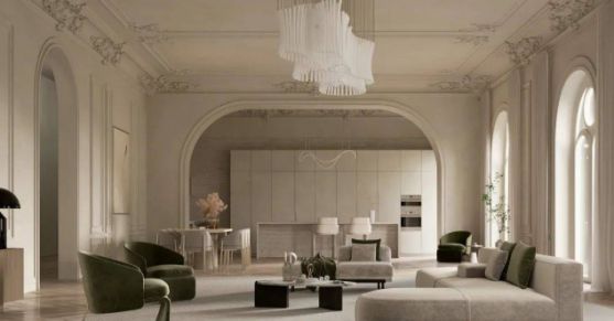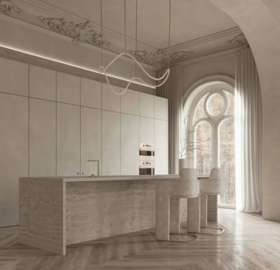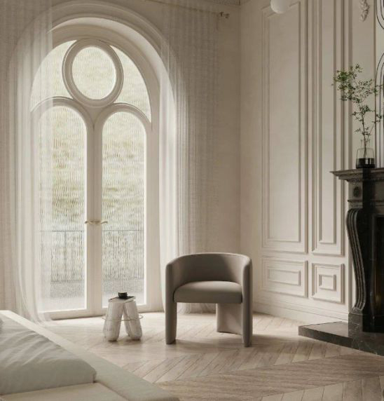 球形吊燈與拱形門窗互為呼應(yīng),為空間帶來幾何美感。由頂及面的奶油色系藝術(shù)漆,凸顯自然的溫柔與質(zhì)感,營造知性、自由、浪漫的法式意境。