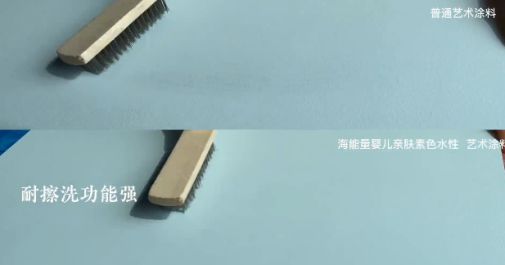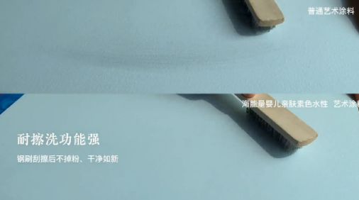 和市面上常見(jiàn)的涂料一起進(jìn)行測(cè)試對(duì)比,使用鋼刷來(lái)回摩擦后,常見(jiàn)涂料有明顯刮痕,而嬰兒親膚素色經(jīng)過(guò)鋼刷摩擦后,觀察面板,其表面并無(wú)損耗。