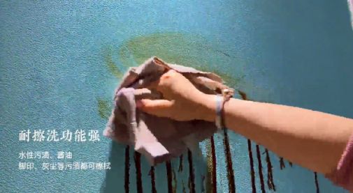 在嬰兒親膚素色涂料上用兒童慣用的水彩筆、廚房醬油進(jìn)行涂鴉,用濕毛巾輕輕擦拭,可觀察涂料表面,擦拭的很干凈,且涂料表面無(wú)損耗。