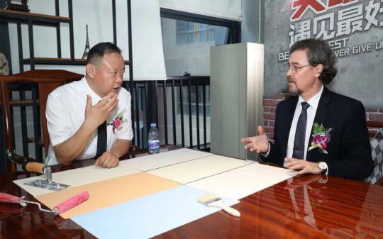 在簽約儀式現場,JADIA董事長武杰與Kima先生交流分享了吉蒂亞瓷玉·高端藝術涂料的產品研發理念,Kima先生也現場體驗了吉蒂亞瓷玉的樣品,并對吉蒂亞瓷玉的產品研發理念及成果保持高度認可。通過與Kima先生的親切交談,JADIA董事長武杰對Kima先生助力吉蒂亞瓷玉品牌發展表示誠摯謝意。