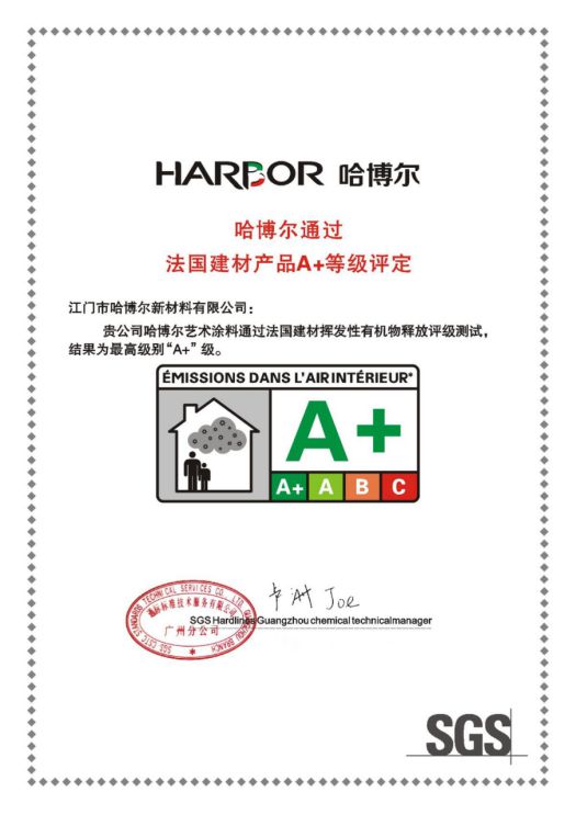 哈博爾藝術(shù)涂料專注于追求品質(zhì),卓越的產(chǎn)品品質(zhì)和絕佳的環(huán)保性能,使其先后獲得了全球范圍內(nèi)最嚴(yán)格的法國A+認(rèn)證、中國環(huán)保綠色產(chǎn)品認(rèn)證。