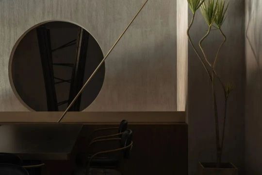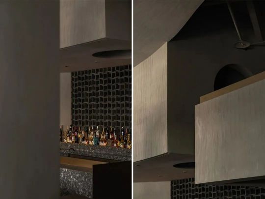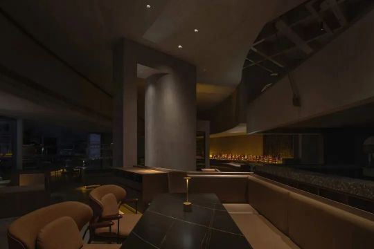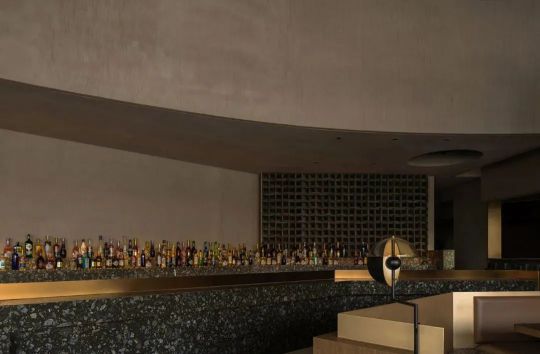 拾級而上可至二樓,這里是帶來沉浸式體驗的酒館,空間情緒的鋪陳在這里達至極濃,可以開啟深夜的微醺與內(nèi)心的自由釋放。空間在視覺上的迷人,聽覺上的深情,味蕾的激情綻放,給人帶來內(nèi)心的共振,從而發(fā)掘心底最真實的自我。鹽在自然狀態(tài)下是不規(guī)則的多面結(jié)晶體,其組合形式是自由的,設(shè)計師在空間中植入了抽象的幾何狀晶體雕塑來還原鹽的自然狀態(tài),為空間加入了靈動感。