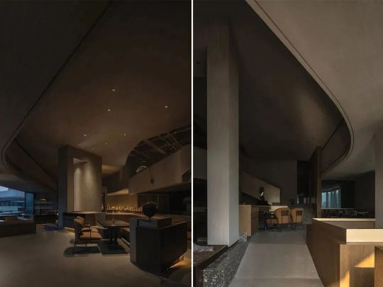 4.8M的層高能塑造出有雕塑感,設(shè)計師在自貢特有的溝谷地貌中獲取到靈感,將河流沖刷出來的峽谷流線作為空間的曲面形態(tài),雕琢出極具律動感的空間構(gòu)成形態(tài)。干枯的溝谷留下水沖刷過的痕跡,在這里巖石固有的質(zhì)感給設(shè)計師留下深刻印象。藝術(shù)涂料恰好能還原這一點,大量的藝術(shù)涂料運用不僅能還原自然,喚醒視覺觸感,給客人創(chuàng)造親切的感受和高貴奢華之感。