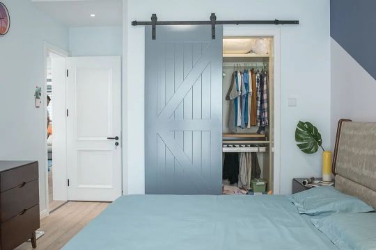 主臥墻體沒有改動,衣帽間單獨(dú)隔離出來,增加一扇谷倉門。谷倉門貼合墻面,不占用空間,使用也很靈活。