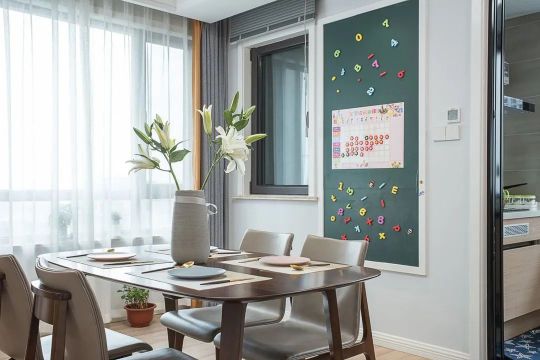 因?yàn)橼s在優(yōu)惠期間,通屋貝殼粉,贈送了一面抗涂鴉的背景墻,可以當(dāng)做黑板墻來使用,效果完全不差,不僅可以給孩子寫寫畫畫,還可以給餐廳帶來裝飾效果,空間不單調(diào)。