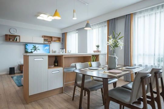 吧臺靠近餐廳一側(cè),擁有儲物功能,可以充當(dāng)小型餐邊柜收納一些餐廳用品。中間鏤空設(shè)計提高座位舒適性,搭配兩把簡易吧臺椅,簡約有范。客餐廳采光好,窗簾依照功能區(qū)獨(dú)立設(shè)計,灰白色簡約時尚。