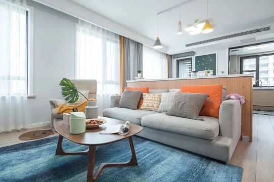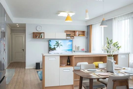 進(jìn)門就是客廳,通屋大面積的選用了白色,加上幾扇大窗戶的光照充足,導(dǎo)致進(jìn)戶格外的明亮。客廳中間做吧臺,看似雞肋卻發(fā)揮大作用,隔斷、沙發(fā)墻、收納一體。吧臺將客廳分隔開,功能獨(dú)立空間通透。沙發(fā)也有了倚靠,更有安全感。