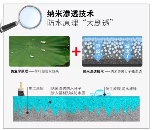 納米滲透防水劑是一種采用高新技術生產的水性聚硅氧烷材料,可在水泥基材表面或深入基材內部,與建筑材料起物理化學反應,生成一層幾個分子厚的不溶性的網狀膜,這種膜具有獨特的防水性能,并與基材一起形成持久性的整體防水結構層。