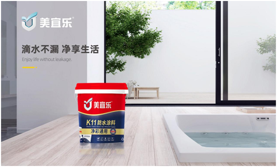 美宜樂在夯實基礎的同時,加大了產品研發力度及技術投入,相繼推出“凈彩柔性K11防水涂料”、“凈彩通用K11防水涂料”兩大新一代凈味彩色水泥基防水產品。該涂料采用全新升級配方,具備較高的附著力及良好的耐水性,可滲入基材毛細孔,堵塞孔隙,適用于長期浸水的環境;除此之外,它還擁有優異的抗拉伸性能,干燥后會在墻、地面形成一層具有柔韌性的、致密的保護層,可覆蓋細微裂縫,抵御輕微的震動或位移,達到“以柔治水”的效果,讓防水效果更持久。
