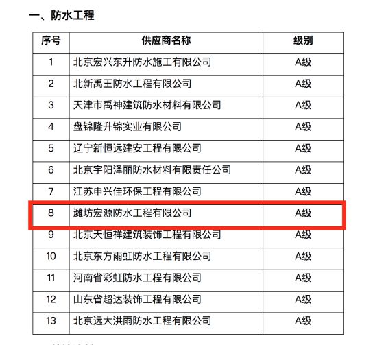 近日,中儲糧集團發布防水工程、外墻涂料、建筑反射隔熱涂料、擋糧門項目入圍供應商分級結果公示。其中,著名品牌濰坊宏源防水工程有限公司獲評防水工程A級供應商。