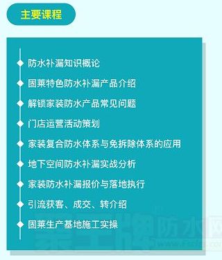 為提升固萊合作伙伴們的營(yíng)銷(xiāo)能力、服務(wù)素養(yǎng)和防水補(bǔ)漏技能,固萊集團(tuán)將于6月27日—6月30日,在集團(tuán)總部舉行為期3天半的防水補(bǔ)漏培訓(xùn)班。不論您是防水補(bǔ)漏行業(yè)零基礎(chǔ)小白,還是想自主創(chuàng)業(yè)的創(chuàng)業(yè)者,或是想要提升業(yè)務(wù)能力的代理商,只要您來(lái)就能收獲防水補(bǔ)漏知識(shí),市場(chǎng)營(yíng)銷(xiāo)知識(shí),建筑基礎(chǔ)知識(shí)等專業(yè)課程,實(shí)現(xiàn)防水補(bǔ)漏知識(shí)和經(jīng)驗(yàn)的最大增值。