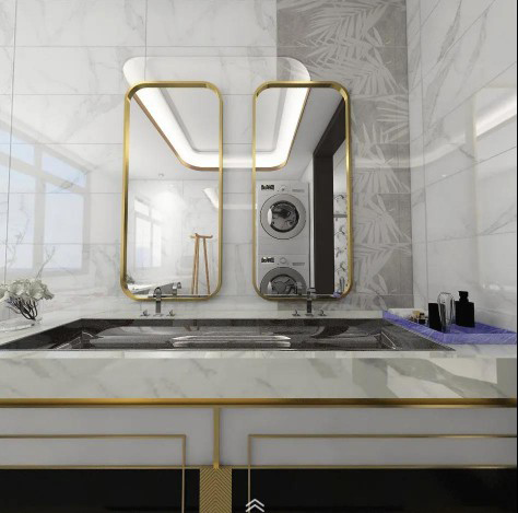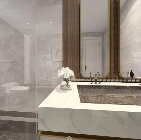“爵士白”亮光磚面在自然光的照射下,讓衛生間更顯明亮寬敞;墻地經典的深淺色調搭配,讓人百看不厭;“灰色森林”花磚裝飾墻面一角,釋放盛夏自然氣息;金屬線條+大理石材組合,高級感滿滿。