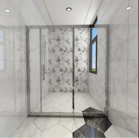 二層衛生間采取了干濕分區的布局,墻磚選用“爵士白”一開三上墻鋪貼,純凈清爽的“爵士白”,質感非常強;300*800mm“卡薩布蘭卡”花磚點綴墻磚,把大自然的元素帶回家,享受這種自然舒適的感覺;地磚在鋪貼時,設計師加入了自己的一些小創意,把淺色系的“爵士白”和深色系的“黑布林”切割成六角磚,“黑布林”的小范圍點綴,個性又時尚。