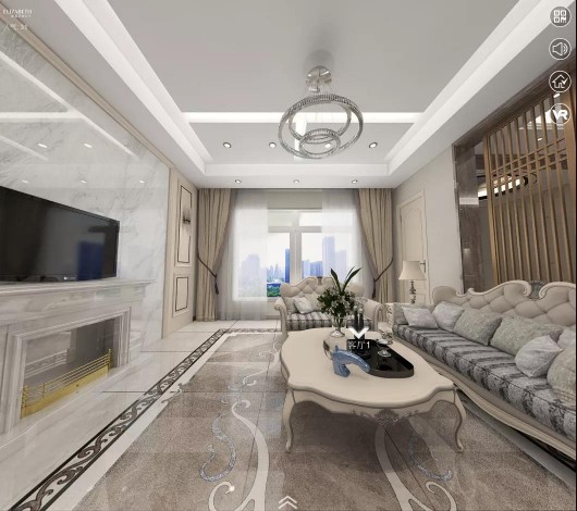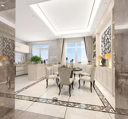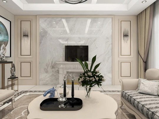 整個居室的公共區域地面統一選擇了伊莉莎白900*900mm規格的“維納斯”和“索瑪棕”組合搭配,把“維納斯”的浪漫情懷與“索瑪棕”的高貴典雅融入空間,打造極具格調的歐式輕奢范;搭配現代裝飾畫,古銅金屬線條點綴,提升空間檔次。