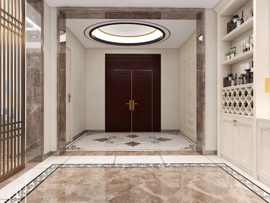 為了豐富空間的層次感,設計師在設計本項目時做了很多細節上的處理,例如,在整個一層空間,你可以看到很多地方都使用了波打線,不僅美觀還起到劃分功能區域的作用;同樣的兩款地磚,卻通過不同的造型切割,打造出各具特色的拼花圖案,讓空間更具設計感。