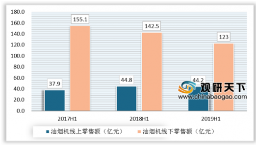 (2017-2019年H1我國油煙機線上線下零售額統計情況)