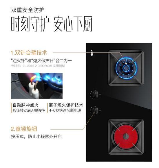 在使用安全方面,華帝鴛鴦灶采取了自動脈沖點火方式和離子熄火保護裝置。為了加強點火與熄火性能的靈敏性,這款產品升級了雙針合璧技術,"點火針"與"熄火針"合而為之,不但讓點火、熄火速度更快,其耐用性和可靠性也很卓越。