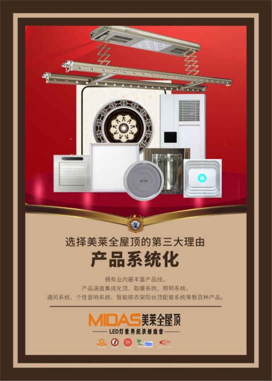 MIDAS美萊擁有業內最豐富的產品線,產品涵蓋集成化頂、取暖系統、照明系統、通風系統、個性音響系統、智能晾衣架陽臺頂配套系統。數百種產品完全可根據消費者的設計要求量身定制,能hold住消費者的全部頂飾需求!