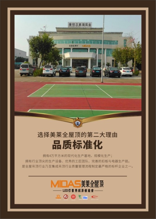成立于1986年的MIDAS美萊,擁有4萬平方米的現代化生產基地,擁有行業頂尖的生產設備、優秀的工匠團隊、完善的扣板與電器生產鏈。天花扣板在造型設計、工藝水準、材質選用、安裝流程等各方面都有嚴謹的標準體系,且更加注重美學品位。是全屋吊頂行業乃至集成吊頂行業質量管理流程制定最嚴格的標桿企業之一。多年來,MIDAS美萊以其創新的技術、出眾的產品和令人信賴的品質,深受大眾喜愛。