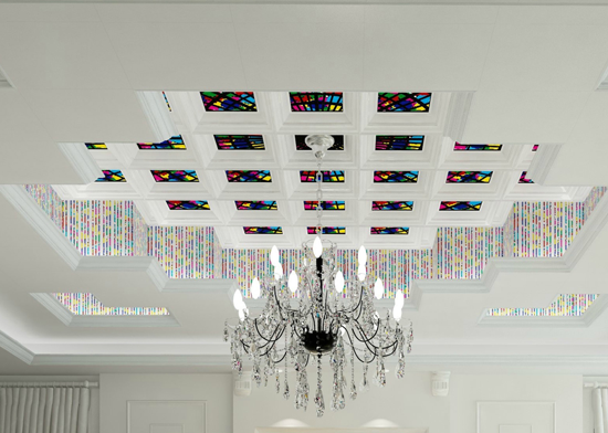當(dāng)然展廳內(nèi)最引人注目的還是品格的米蘭陽(yáng)光頂和藝術(shù)星空頂,一批又一批的觀(guān)眾駐足欣賞。米蘭陽(yáng)光頂保留了米蘭大教堂圓的特色,將“疊彩文字”與窗戶(hù)繪畫(huà)結(jié)合,色彩繽紛絢麗;格柵、畫(huà)框以及立面的組合,形成三個(gè)鮮明的層次,賦予客廳高闊的空間感。藝術(shù)星空頂?shù)撵`感來(lái)源于浩瀚星空,白色邊框搭配定制的12星座星空?qǐng)D案,讓整個(gè)臥室如同一片璀璨的星空,浪漫而唯美。