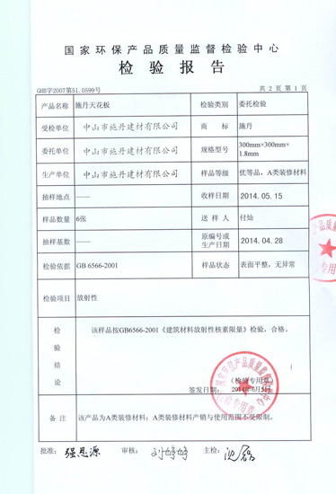 施丹建材積極響應國家環保建議,關注環境保護和消費者健康。吊頂、背景墻和幕墻先后通過了各種國家和行業級產品測試和認證,包括甲醛釋放和放射性測試、防火性能測試、防霉測試報告、金黃色葡萄球菌抑菌效果測試、國家環保測試、國家質量檢測測試等。