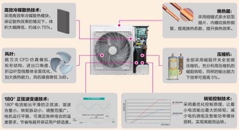 格力雅居外機采用降噪電機及柔性管路,內機選用專利高效降噪蝸殼、風葉,對噪音源處進行控制優化,達到了更高的靜音要求。