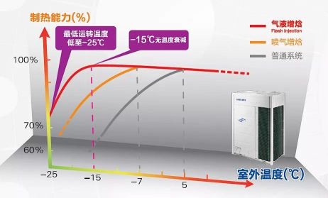 通過抽取部分中間的壓力冷媒,將主循環(huán)冷媒進行過冷卻提高效率的同時,顯著增加了壓縮機的排氣量,也有效抑制了排氣溫度過高,使系統(tǒng)在嚴(yán)寒氣候下制熱能力提,在制冷時亦可增加冷媒量。并自動調(diào)節(jié)壓縮機頻率,有效提升系統(tǒng)滿負(fù)荷及超低負(fù)荷工況下的系統(tǒng)效率,體驗出色的非凡熱力。