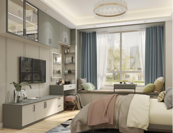 臥室是家里和我們最親近的地方,它包含了我們生活的方方面面。箭牌全屋定制【米倫】以溫和克制的主色,讓人們在臥室休息時更加放松,并利用墻壁空間打造儲物系統,為梳妝臺留下更多空間。吊柜的設計可用于容納不常用的物品,地板將會堆得更少,空間的清潔度也會更好。感受整潔空間的陽光,生活會豁然開朗。逐漸溫暖的陽光也提醒我們:“夏天快到了?!爱斚s在夏天歌唱時,在柔軟的床上聽窗外蟬歌唱是高強度生活中一種早已被遺忘的幸福。