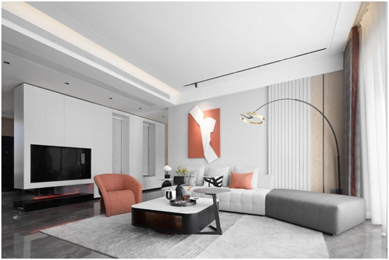 客廳以高級而穩(wěn)重的黑白灰簡單鋪陳,賦予空間干凈利落的視覺體驗和舒適溫馨的氛圍。簡約現(xiàn)代的生活藝術(shù)感,在新穎的造型、色彩、家具的擺放中體現(xiàn)得淋漓盡致,局部的橙色作為點綴色,不僅給偌大的空間添加了一抹活潑的色彩,更是對單調(diào)家居生活的一種調(diào)和,增添一絲浪漫的氣質(zhì)。