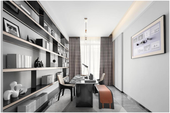 “簡”是一種內(nèi)涵一種修養(yǎng),一種平靜,清雅代替浮華,讓靜然遮掩喧囂。良好的氣氛下營造出透亮,潔凈的視覺感受。書房整體風(fēng)格雅致清淡,成熟穩(wěn)重。銀灰色與低飽和度的黑色相融合,書柜上精致的擺件、立體有型的藝術(shù)裝置品、造型獨特的燈飾,都體現(xiàn)出書房十足的人文底蘊與藝術(shù)氣息。