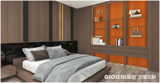 臥室的搭配風格低調的質感,優雅的基調,點綴低飽和度的橘色,一種浪漫詩意與空間設計共感,襯托出休憩空間的舒適氛圍。