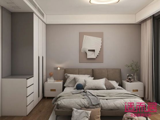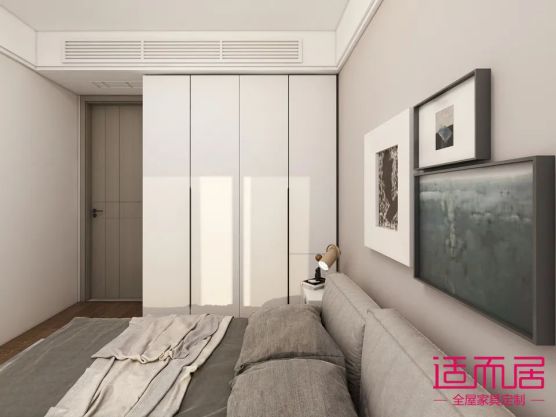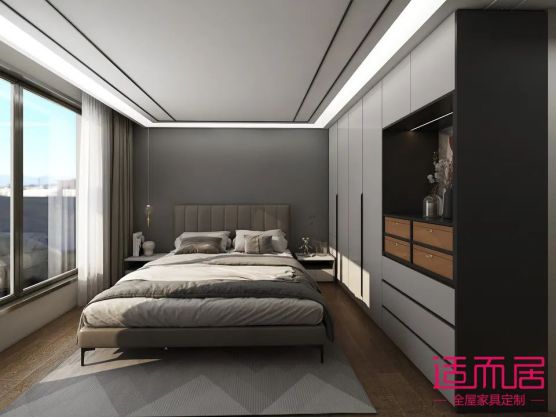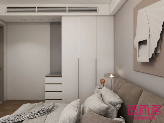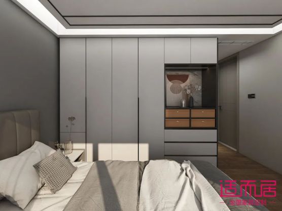 主人房已灰色調(diào)為主色調(diào),迎合了房子主人對高級感的需求,莫蘭迪灰的衣柜+灰色的床+灰色乳膠漆的床背景墻,高級感滿滿。