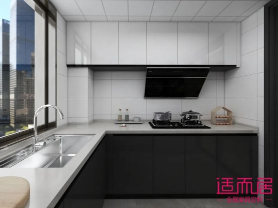 顏色搭配上,也是采用黑白搭配,吊柜用亮光白,提亮這個空間感,地柜采用亮光經(jīng)典深灰,耐臟且高級。