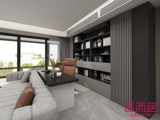 橫廳的戶型,沙發(fā)背面留部分區(qū)域做辦公區(qū)域,書柜的整體以開放格為主,搭配格柵和莫蘭迪灰的設(shè)計,時尚又實用。