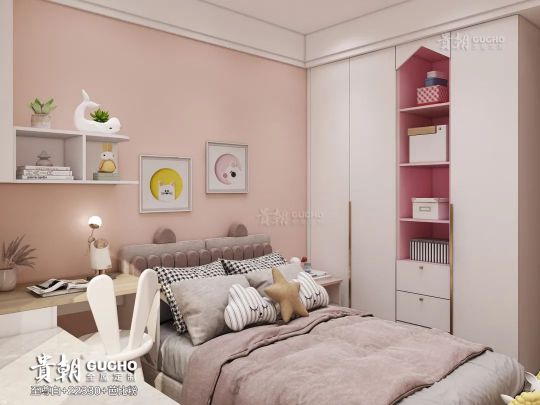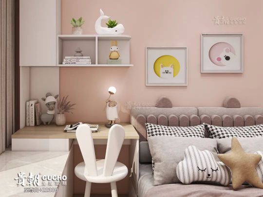 夢幻粉的兒童房,充滿了童趣。整體色彩采用了粉紅色+白色+原木色的搭配,給人一種溫馨舒適的感覺。另外,衣柜做了一個別致的造型,豐富了空間層次感。再搭配充滿了童趣感的兒童床和椅凳、掛畫等,這簡直就是小公主夢中的童話屋啊!