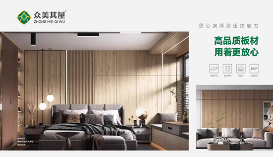 眾美其屋的6D深壓紋工藝,是勞動者智慧與機器精度的完美融合。通過德國進口尖端設(shè)備,將木紋的肌理、布藝的溫潤、皮革的質(zhì)感,以微米級精度復刻于板材表面。這不僅是技術(shù)的突破,更是對自然的致敬——讓都市家庭無需遠行,便能觸摸到森林的呼吸、感受陽光的溫度。