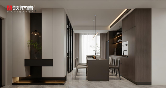 真正的整家定制美學,更注重人文關懷與個性化表達。領航者家居摒棄“千屋一面”的標準化設計,為每個家庭提供專屬定制服務。設計師會深入溝通用戶的生活習慣、審美偏好與家庭結構,為有孩童的家庭設計圓角柜體與可調節收納格,為職場人士打造隱藏式辦公區,讓門墻柜不僅契合空間尺度,更精準匹配居者的生活軌跡。
