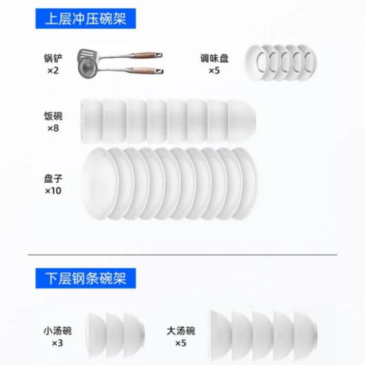 柯菱集成灶110L消毒柜體的合理設計,能裝下整整20個盤子+16個飯碗+5個碟子+60只筷子,讓你的餐具不必到處流浪。最大化的滿足了大家庭的餐具存放空間需求。收納更多,也能輕松擺放。