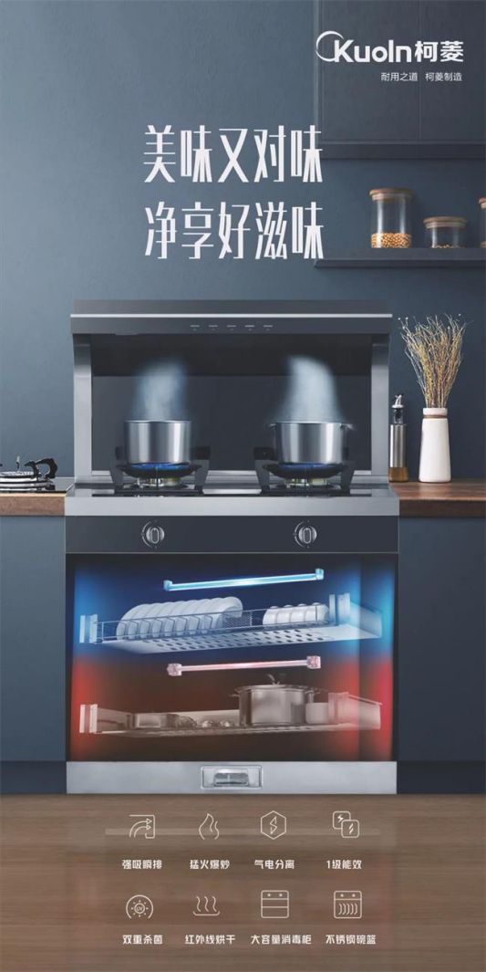 柯菱集成灶設計了消毒柜紫外線+臭氧雙重消毒功能,大腸桿菌、脊髓灰質炎病毒等病菌,給你無菌體驗!
