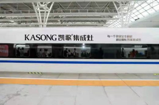 凱歌集成灶品宣方面,斥資千萬,并與中國高鐵達成戰略合作,在列車、站臺等位置全方面投放,全面提升凱歌品牌形象。