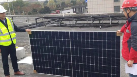 本項(xiàng)目組件采用450Wp高效單晶硅組件,共安裝組件1998片,峰值功率 899.1kWp,每18片組件1個(gè)組串,共111個(gè)組串,每7個(gè)組串接入1臺(tái)50kW組串式逆變器;每14個(gè)或15個(gè)組串接入1臺(tái)100kW組串式逆變器,每4個(gè)逆變器接入1臺(tái)400V交流并網(wǎng)柜,兩個(gè)并網(wǎng)柜布置于廠區(qū)生產(chǎn)廠房一樓配電房,出線分別接入配電房1#、2#變壓器低壓側(cè)母線并網(wǎng)。