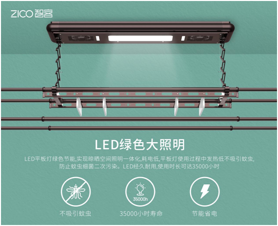 隨著LED照明技術升級和普及,家居照明燈飾、汽車照明等都用上了壽命耐久、光照亮度更佳、更加健康護眼的LED光源,如今智能晾衣機也不例外,響應綠色環(huán)保的號召。ZICO智客的LED燈板與機身融合一體,發(fā)光柔和舒適,發(fā)熱低不會吸引蚊蟲、避免蚊蟲攜帶細菌污染衣物,LED燈源有35000小時的使用壽命、電機耐用達20年之久。