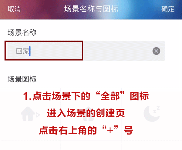 2.輸入場景名稱“回家”,選擇“回家場景”圖標,點確定