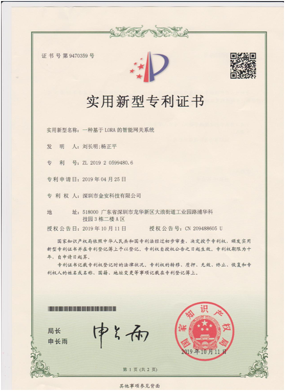一種基于LORA的智能網關系統(專利號:第9470359號)